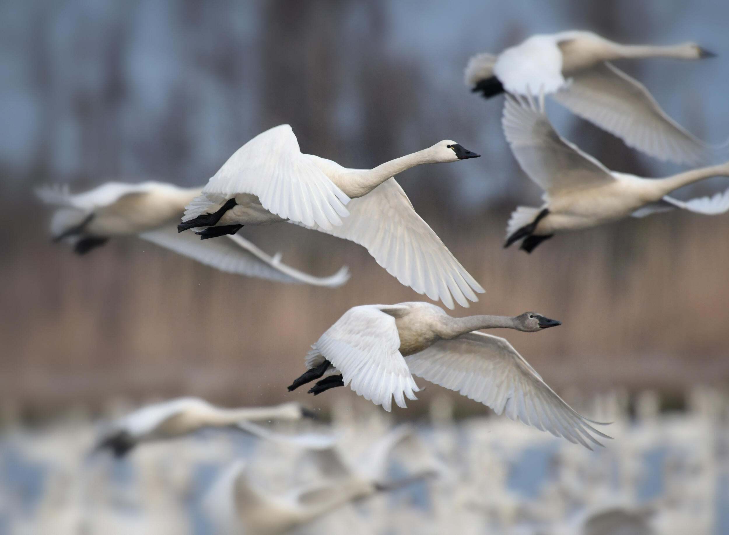 Snow Geese: Traveling in immense and noisy flocks, snow geese can be spotted in the Midwest as they fly to the Arctic Circle for their summer breeding season. © Gordon Lass